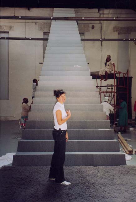 It becomes clear that there is certainly not room for everything - a snowstorm projection will have to be set aside for a later date. The staircase to the stars which is the main element of Doreen's installation is well in progress and stretches from floor to ceiling. Then there are two other pieces - and the rest of the space will be filled with Antoinette Murdoch's hearts woven from pink tape measures, a dress constructed from paper dress patterns, and other witty pieces addressing life, domesticity, passion and turning 30.