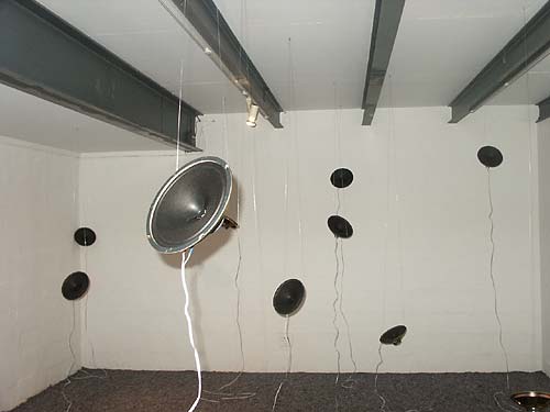 Entering James Webb's sound installation 'Phonosynthesizer' at the NSA is a curiously ambiguous experience. Confronted by what Webb refers to as the "naked" technology of the piece, (suspended speakers, flex, fishing gut and underfelt), the viewer/listener is presented with the aural results of contemporary technology gone wrong.