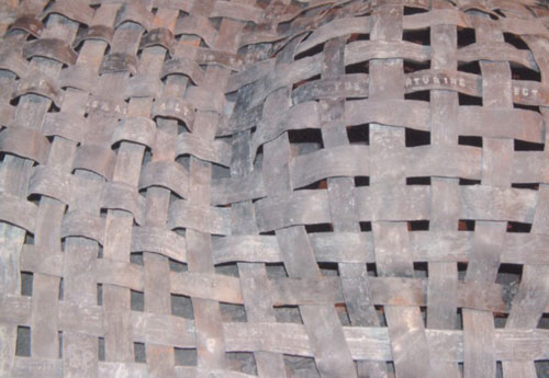 'The work is about process: chemical process that operates beyond the artist's control, and controlled process. Woven from copper and lead strips, two new works, constructed as grids, swollen with empty pregnancies, provide a text, censoring itself, in rhythms of weft and warp.