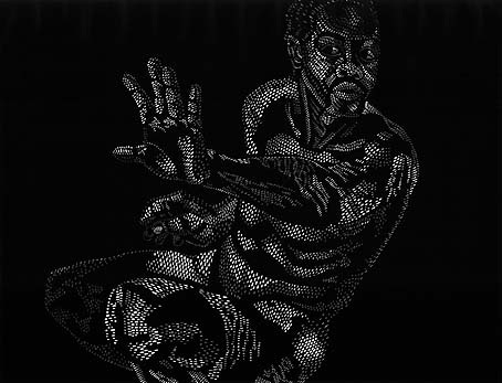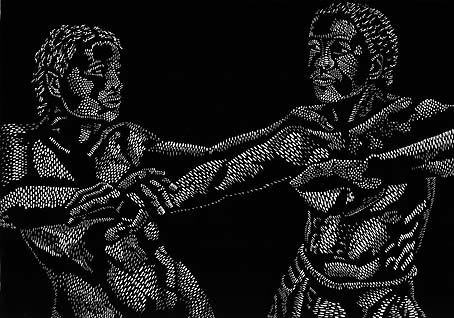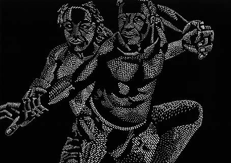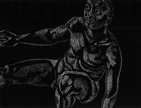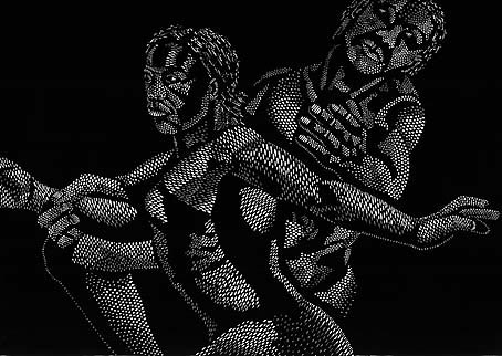 His imagery is generated by a blitz of small oval, triangular, round and arc-shaped blobs of white on black. These forms create an effect like a shower of light as they fall onto the anatomies, modelling them in three dimensions, and defining the shallow space in which they exist.