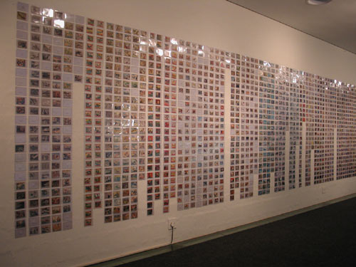 Kendall Buster's installation, titled Model City, had the greatest impact on me visually. The installation of over 40 blue child-sized tents was suspended across the main gallery. One could view the work from beneath upon entering the space and from above, looking down from the Mezzanine Gallery . Standing underneath, the effect of the clear blue sky was claustrophobic, and seen from above, the hints of wave-like shapes were enough to make one nauseous. The installation was spectacular, almost surreal. But only after viewing some of the trading cards on offer by Siemon Allen, did I realise that these were in fact tents. Tents that are used as portable shelter, like those used by the army. This is in marked contrast with Buster's Model City, which is essentially a tranquil turquoise-blue cityscape.