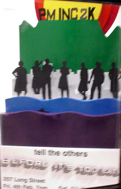 A balmy evening with a live band playing outside the AVA galleries in the Church Street Mall made for a highly enjoyable Art Night on Monday, January 25. Karin Dando and Ismael Thyssen launched shows at the AVA, and at the top of the street, Mark Coetzee showed a fine selection of contemporary stuff, with a video by Clive van den Berg, and a white silken inflatable construction by Luan Nel. "Tell the others, before it's too late' was the message of a pm inc. construction in the small gallery - a witty advertisement, and art piece in itself, for a forthcoming pm inc. event. The big disappointment of the evening was that Tom Cullberg's Featherdome , a promised highlight, had been badly damaged by movers after its appearance at the Gay Millennium party, and could not be installed. But the hundreds of people who turned up for the evening seemed to be enjoying the gentle strolling, dancing, eating, drinking , antiquing and art viewing very much anyway.
