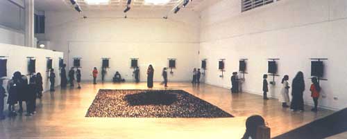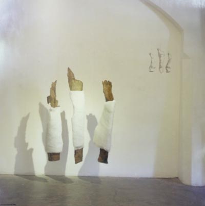 Shelly Sacks grew up in South Africa and moved to London some time ago, where she continued to produce art. She is exhibiting what she terms a "social sculpture". This term was first used in the 1970s by Joseph Beuys, to describe an expanded conception of art in which thought, speech and discussion are core "materials". Given that social sculpture arises out of the perception of all human beings as artists, it requires us to shape a democratic, sustainable and free social order in tune with our creative potential and our right to develop and express this potential. Expanding our conception of art in this way lifts the aesthetic out of its confines to a specific sphere or media, relocating it in a collective, imaginative work-space in which we can see, re-thing and reshape our lives. In this installation, Sacks deals with the threatened banana trade of the Windward Islands. The work is made from dried banana skins and the story is told by recorded testimonies of the island growers. The problems faced by small scale producers of bananas are brought to the fore. The GATT agreement on world trade stipulates exact and limiting specifications for bananas that are to be sold internationally. This effectively cuts out smaller scale producers and reduces the varieties available. Bananas are a politically charged commodity and their trade forms part of complex networks influenced by politics and drug trafficking. Those who unite against the unfair trade restrictions are often threatened with violence. Shelley Sacks is Head of Art at Oxford Brookes University. She worked for many years with Joseph Beuys in Germany, and lectures widely on both Beuys' and her own social sculpture activities.