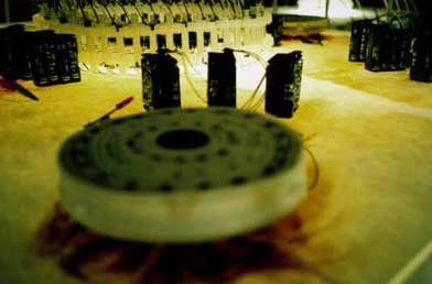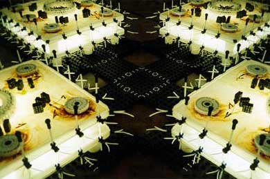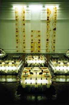 by Michelle Matthews "I really like it," I stutter. "Thanks Michelle," says Alan. Alan, typically, didn't elaborate and I, thankfully, didn't have to explain. I'm not quite clear on why I like Alan's exhibition, just as some people can't explain why they don't. Like the person who scrawled nervously in the visitor's book, "I'm lost. I think this is probably pretty bad. Sorry." Before I launch into an attempt at elucidation I should point out that, yes, I visit openings, especially when I feel like an after-work glass of wine, and I got an A for art in matric. That's the extent of my art knowledge. It's probably more than most people who are visiting the current show have. The installation is in the National Gallery - it draws groups of schoolchildren, tourist couples, families on their monthly "cultural outing". I spent a Saturday morning in the gallery and it's Alborough's installation room where people spend the longest. Old age pensioners get down on their hands and knees to see where the lights in the boxes come from. Kids run their hands through the trays of dead batteries. The visitors know they've found something special. But what do you think it is?" asked an old man in a safari suit. Glowing tortoises, parking lots, ballerinas on stage, Gotham City, concentration camps, African huts, futuristic aerial photographs � most people want the installation to refer directly to something recognisable. "I don't know," I said. "I think he just likes making them." The man nodded slowly. People are either suspicious of or intrigued by things that don't reveal themselves to them almost immediately. When it comes to art, they, like the girl in the Diet Coke ad, expect to grapple briefly with an object before deducing its moral, as if all works were inherently didactic. For a long time South Africans were reasonable in expecting messages in their artworks, since much work was politicised. Perhaps this is the reason for the varied reactions to Alborough's work. Some people are exasperated with what they see as the indulgence of it, while most are just pleasantly surprised. Alborough's installation is unapologetically aesthetic without spoon-feeding a meaning, and we don't see that very often. This is how I see Alan working. He's an engineer/mathematician-cum-sculptor. He sits and stares at a peg. He dismantles, rotates and juxtaposes it with other objects in his mind. At night he dreams of patterns and graphs. He doodles a lot, slotting geometric shapes together obsessively. No wonder the Alborough reticence. "Well," I can see him saying, "the pegs fitted with the syringes and I, uh, liked the balance of that. It made sense." That's it really. The world is full of building blocks and Alborough likes to play with them. Not that Alborough doesn't have a definite plan of where his work is coming from or going to. The installation has been growing and developing since it started in Grahamstown last July, where Alborough was honoured as the Standard Bank Young Artist of the Year for Visual Art. The pegs, syringes, batteries, corrosive elements and lights had all been used before in different combinations. It wasn't long before Alborough saw the end point of the installation, and you can too. In the SANG he's got four blank sheets of absorbent paper hanging from the wall, an incomplete "tortoise" and an empty plastic container all set up. At the exhibition's next stop these blank squares will be filled - the paper with the stains from the corrosive coils, the arched object with the used coils and the container with the spent batteries. Alborough's got it plotted out and it all fits perfectly. I smile when I see the URL to the exhibition's accompanying website: www.alanalborough.co.za. The "anal" just jumps out at you, doesn't it? At this point the only element that is not totally under the artist's control are the orangey blurs made by the corrosive coils. Still, he has set up the coils so that the patterns are fairly predictable. It's not as control-freakish as his 1996 works at Goldsmith's College in London, where he actually plotted corrosion marks on hand-made graph paper. But the light-boxes are still machines, despite the fact that their output is variable. I think that's why I like Alborough's installation. It has function as well as form. He has made something that makes something else. So, as well as looking good, the objects are "useful". Like the i-Mac he has set up in the corner. Like the chair from furniture contractors Innovation that he has put in front of it. The installation leans more towards design than "pure art" and in today's society that has more currency.