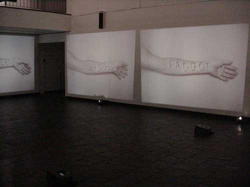 by Sue Williamson From the floor of the darkened gallery, projectors throw images which blanket the four walls - a chain of single outstretched arms marked with the names used to insult gay men - 'moffie', 'faggot', and the French word, 'pede'. The arm images stretch around the room to meet other images - of the same names made from large letters formed from fresh pink rosebuds, and laid as floral tributes on the monument to Oscar Wilde in Paris. The flower letters have been made by Mark Coetzee, during a four month stint, funded by the National Arts Council, at La Cite Internationale des Arts in Paris. The carved stonework of the grave around the flower names is marked with old lipstick kisses, placed there by drag queens who come to pay tribute to Wilde's life and courage in the face of his persecution and imprisonment by society for daring to love another man. As the projectors are on the floor, it is not possible to cross the gallery without having one's moving shadow thrown on to the images and in this way becoming part of the pilgrimage to the monument - a poignant and successful piece of staging by the artist. The pejorative names cut into the arms outstretched around the room remind one of the periods in society, most notoriously in Nazi Germany, when people have been forced to carry physical branding to indicate to the world that they fall into a certain category. In this case, the arms are reaching out to the world, the names displayed proudly. Gay men have accepted the insults and turned them around by using them as names of solidarity. Same sex love in the face of a society that in spite of a new constitutional freedom still seethes with homophobia - one only has to think back a few weeks to the outrage from a large section of the community that Cape Town might be promoted as a gay friendly city - has always been the theme of Mark Coetzee's work. 'All Our Sons' is an effective and moving installation, and shows a considerable development in depth, subtlety, and artistic finesse since we last saw Coetzee's work. Upstairs on the ArtStrip and in the Long Gallery prints and drawings of more arms and projected images of long gloves marked with more names get a little wearisome. One swallow doth not a summer make, and one wishes Coetzee had found a way to introduce a little more variety into his supporting work. Having said that, the main installation of 'All Our Sons' provides a compelling and moving art experience for viewers, and one that comes highly recommended.
