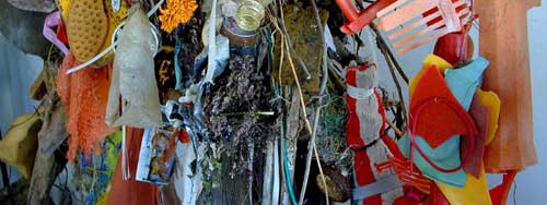 One presumes that much the same is meant to happen with the larger installation. It too clusters objects of the same colour or texture, providing interesting visual possibilities, but the installation fails to excite in the same way. Perhaps it is that these objects have failed to go through any real transformative process, or perhaps it is the sheer overload that leads one to gloss over the work. The idea, after all, is not new; Kurt Schwitters made art from the rubbish of the streets, Rauschenberg spawned the art of Assemblage using his own rumpled bed stained with paint, and Duchamp explored the random, chaotic and mass-produced before World War I. More recently two British artists, Tim Noble and Sue Webster, created an intriguing series of works from piles of junk that produced meticulously rendered self-portrait shadow images, while locally, Penny Siopis has examined notions of history and politics through collations of the discarded.