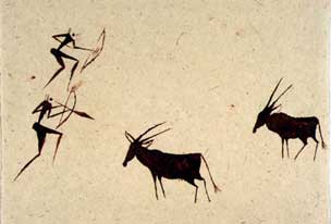 Although the work from the three workshops is grouped separately, the distinction between these three 'producers of Bushmen culture' is not clearly signposted. Even if it were, I do not think this would in itself be adequate. For unless we can distinguish fundamental differences between the historical origins and ideological and practical orientations of the three workshops we would continue to view them as essentially one project, especially since all the work selected for this exhibition draws on subject matter that is illustrative of 'traditional' San. This emphasises a sense of community and continuity, whereas there are some critical distinctions that should not be overlooked if we are to gain more than a romantic vision of contemporary San art.