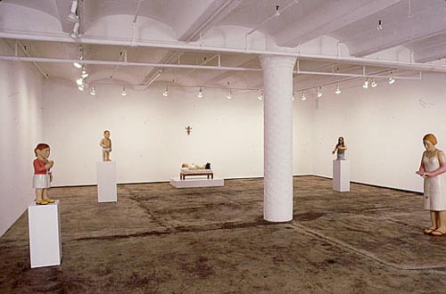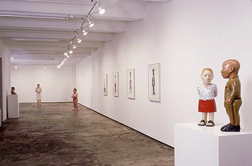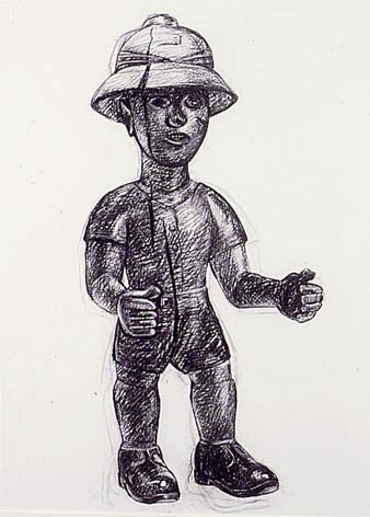 Claudette Schreuders' 'Burnt by the Sun' at the Jack Shainman Gallery, New York by Laurie Farrell This is a show not to be missed. By all accounts and considerations, Claudette Schreuders has made a splash in New York City. Hailed by New York Times art critic Holland Cotter back in 1999 as one of the stars of the Museum for African Art's 'Liberated Voices: Contemporary Art from South Africa', Schreuders recently received another positive nod from the Times for her first solo exhibition at the Jack Shainman Gallery. Add to the mix that the new show has been a complete sell-out, and one can truly say that she is "having her day in the sun". The installation is stunning and the body of work includes eight major wood carvings and four charcoal drawings. The objects greet and welcome you into Schreuders' world of intimate memories, personal introspection, African and Western icons and referents. All are embodied in ambiguously charming pieces and are presented in an intellectually savvy manner. Entering the exhibition space, one finds a pair of figures entitled Conversation (2000), a self-portrait of the artist and a colonial officer. She wears a short red skirt and white long-sleeved shirt decorated with blue flowers, and her hands are held behind her back. The artist's effigy stands innocently looking at the police officer. The officer's hands are tucked into his khaki pants, suggesting a sense of ease as these figures engage in a friendly exchange. Directly following the conversing pair are a series of four charcoal drawings that depict different wooden colonial figures. The colonial figure, or "colon", is a widely recognisable icon of African art produced for both tourist and indigenous markets in Africa. Perhaps the most well-known colon figures are those by the Baule people of Cote d'Ivoire. Such figures wear European pith helmets and usually have accoutrements which recall the presence of Europeans in Africa. However, according to the late Philip Ravenhill, the term "colon" is also a signifier for traditional African wooden carvings to which industrial paint has been applied. In one drawing, Untitled (2000), the colon figure has a series of vertical cracks running throughout his body, emulating those found in wooden sculptures, and is animated through the suggestion of hand and foot movement. The figure wears his military hat, short-sleeved shirt, and shorts that reveal a muscular physique. Moving further into the exhibition, Twins represents another figurative pairing. This time two girls sit beside each other wearing identical green dresses with plain white buttons. Schreuders states that these figures were inspired by a photograph of her sister seated beside a servant's child. Another level of interpretation can be found in Schreuders' reference to Nigerian "ibeji" figures. "Ibeji" are carved wooden twin figures that represent surrogates for deceased twins. This work shares a formal and thematic relationship to the Twins (1997) piece that she created as a memorial for the servants' children from her past. Charming pieces like these complicate notions of complacency embedded in the innocence of white South African childhood during the apartheid era. Schreuders' use of intimate moments from her past and people that touched her personally provides a potent forum for personal reflections on reconciling one's childhood with issues of socialisation and survival. The next two works, Owner of Two Swimsuits (2000) and Burnt by the Sun (2000), illustrate stories of "excess that involves taking more than you should, or being exposed to more than you can cope with" (Schreuders, press release). Burnt by the Sun, the largest figure on exhibition, portrays a white South African woman. Initially, the woman appears to be wearing pink evening gloves, yet on closer examination one discovers that the pink is the result of serious sun overexposure. Another highlight of this exhibition is Lost Girl (2000). As a mermaid figurine with her tail flipping up behind her, a yellow snake encircling the base, and her hands held out suggesting an expression of martyrdom, one cannot help but interpret this piece as a cocktail of various references. One that readily comes to mind is Mammy Wata, or Mother of Water, a charismatic water-spirit introduced to West Africa from Europe around 1900. Usually depicted as a beautiful woman with flowing black hair who controls snakes, Schreuders' Lost Girl represents a composite of African and European influences. Sunstroke (2000) is the largest assemblage of pieces in the exhibition. A man, apparently experiencing the intoxicating effects of sun sickness, reclines on a bed with his feet propped up against a nail fetish (or power figure). The power figure, also called "nkisi", is zoomorphically represented as a dog that has been activated (or called into action) numerous times by the insertion of wooden and iron nails. Power figures are found in many Central African cultures where potent medicines and materials are packed into a sculpted form (in this case a wooden dog) which acts as a receptacle. These figures are ritually called into action by driving sharp objects into their surface. An additional layer of interpretation to this piece is given by the presence of a crucified Christ figure (with four rather than three nails impaling the hands and feet, suggesting a Romanesque or medieval antecedent) that hangs on the wall above the bed. The death of Christ on the cross is the central image in Christian art and a visual focus of religious contemplation. Numerous sources have been assimilated into this wooden realm of figures that function as metaphors, or responses to life and religion in Africa. This show offers numerous points of engagement. The sculptures inhabit individualised spaces and yet cohesively come together as a strong body of work. Additionally, as Jack Shainman states, Schreuders' work is paradoxical in that it appears simplistic at first, yet, on closer examinati