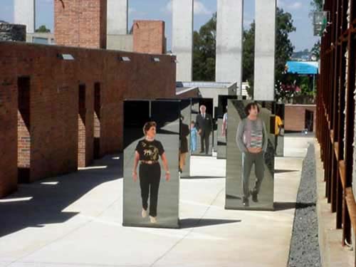 This walk is not without its physical distractions, and is interrupted by freestanding mirrors. These randomly placed mirrors feature life-size colour cut-outs of people headed in the same direction. Up they go, young and old, a full colour spectrum of citizens in everyday garb. Somehow your reflection gets in there too. Small recesses en route allow one to reflect on early cave paintings, impressionistic markings describing the first encounters between our country's rival cultures.