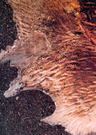 The two works on the gallery's far, short wall (all the works are untitled) are just taller than they are long, their compositions dominated by sheepskins spread across the format in an irregular starburst. In the work on the right there is heavy scoring and the skin is a dark, burnt umber in the centre. Rents in the skin reveal a scarlet blood-like ground beneath. The skin is set into a ground of dung a little lighter in colour than the work's centre. The work on the left bears a skin lightly scored in parts with what may be the beginning of an image, but the whole is dominated by a section of dirty white blanket with two red bands. This clings closely to the surface of the sheepskin and has warped from its original rectangular shape in the process of its fixing there. The red stripes in the blanket play off against a red splatter in the top half. A literal interpretation is tempting - that this represents spilt blood from the circumcision process - but this is offset by the physical and abstract nature of the work and the response evoked by this. In several other works scraps of fabric (sis or isishweshwe) serve a similar purpose.