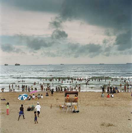 For example, a photo of Durban beachfront. In the left foreground, some kids caught in a balletic moment of imminent motion. Centre foreground, the lifesavers' podium representing a demarcated area of safety and institutional surveillance. As your gaze moves further out, you encounter the next line of figures, strung across the second of these horizons of ever-decreasing safety, the place where the sand meets the sea. They all seem to be gazing out to sea, waiting, not expectantly but with certainty. The next line are the swimmers in the water, silhouetted against a sullenly crumbling wave.