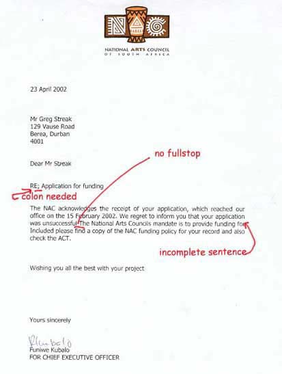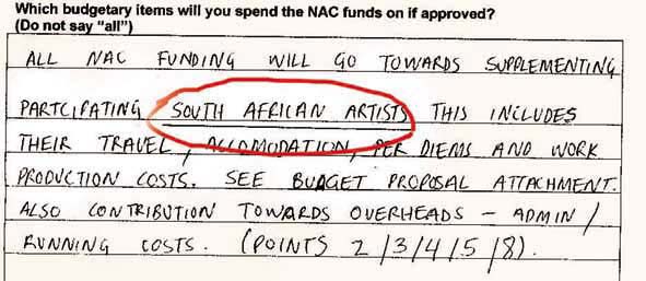 The NAC's inability to read and/or understand a proposal is not a one-off failing. Artist/curator Greg Streak's critically acclaimed 'Pulse' project was also rejected, it would seem, for much the same reason. Supported by the world-renowned Rijksakademie and substantial funding from abroad, it would appear to be a highly suitable project fulfilling the NAC's stringent criteria for success. Streak received a rejection letter signed by Funiwe Kubalo (someone who clearly does not bother to read what they sign). It was full of errors, the most glaring of which was a sentence that simply ended midway: "The National Arts Councils mandate is to provide funding for" - with no conclusion and no full stop. Included was a reminder to Streak to check the ACT for guidelines next time he wished to apply.