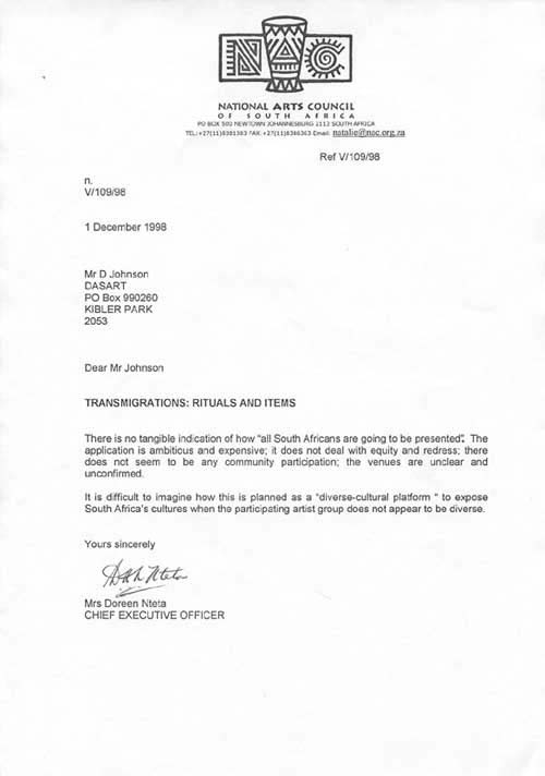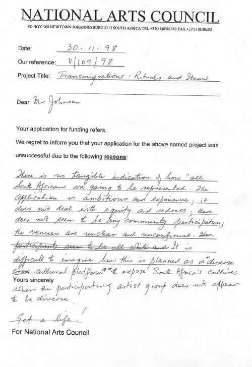 Such stories must surely be topped, however, by the experience of the DASART group, currently showing 'Transmigrations' at the Pretoria Art Museum. Included on the exhibition is a board covered with bureaucratic detritus from the organisational side of the art world, on which is included is a formal rejection letter from the NAC in 1998, accompanied by another slip of paper - its handwritten draft. Written in a dismissive tone, the draft ends with the sentence "Get a life", which has subsequently been crossed out.