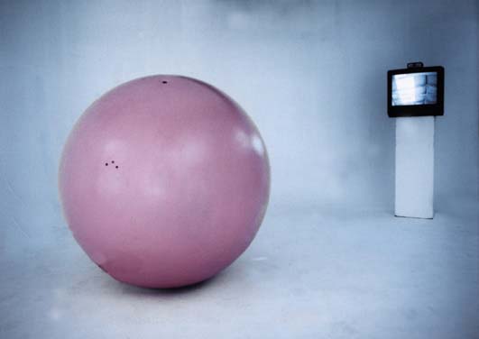 Video Ball, which was presented against an infinity screen in The Cold Room's photographic studio, comprises a pink waist-high sphere and a television monitor. A tiny camera pokes out of an aperture in the sphere and wirelessly relays footage to the monitor. There is a heavy battery eccentrically housed in the sphere, which gives it an unpredictable lurch at the slightest nudge, especially if this is in the direction of the infinity screen's glorious transitions. I was lucky enough to find myself in the studio with painter John Murray who was surprised to see himself upside down on the monitor. I sorted him out with a deft 180-degree roll of the ball.
