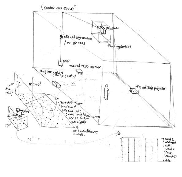Up the creaky stairs, in a darkened room, a peculiar object on the wall opposite greeted me. A small box was at the apex of a cluster of wires, which radiated skirt-like. To my left was a projection of what appeared to be the same object with lights dancing across its surface like a hi-fi's EQ indicator. Closer inspection of the object revealed small red LEDs along the wires. One could just discern a brief flash from each of these. The infrared camera opposite records this activity much more effectively than the human eye, the footage relayed to an adjacent video projector.