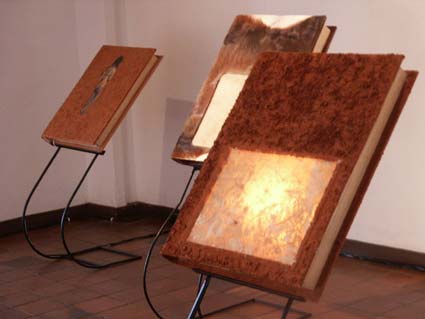 Intertextuality. In one of the strongest works on the show, Greg Streak shows Public Speaker, a piece which looks like the funnel of one of those ships which used to steam into the harbour, bringing news to Durban from the old country. Raking backwards at a slight angle, the pristinely made white structure is marked with a row of tiny knobs attached to wires� which in turn are linked to microphones placed throughout the exhibition space. Leaning over the funnel one becomes privy to snatches of unguarded conversation. Amusing, but also unpleasantly reminiscent of the time when all activists believed their phones to be tapped, and important conversations were carried out at the bottom of the garden. Langa Magwa shows three 'books'. Large, the size of encylopaedias or state records, the books are made of the materials of Africa, hide and vellum, and in making them unable to be opened, merely the shape of books, Magwa questions the received knowledge by which this country was ruled.