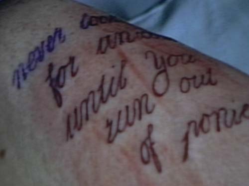 To the soothing accompaniment of songs such as 'Mack the knife' and 'I've got you under my skin', an entranced Johannesburg audience recently watched as artist Kathryn Smith had her left upper arm tattooed. 'Don't start looking for unicorns until you've run out of ponies' reads the completed tattoo.