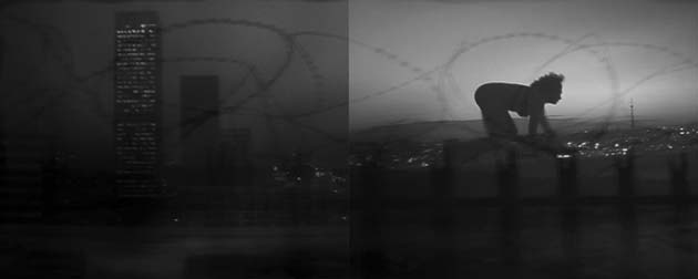The feline grace of the burdened figure, the fact that this ritual is taking place at the break of day, a time of new promises, the elevated position above the city, the very real possibility that a gust of wind, a shift of weight could topple the artist from her perch suggests a ritual of penance, of absolution, taken, perhaps, on behalf of the metropolis spread below. The seriousness of the purpose, the difficulty of the task fills the screen.
