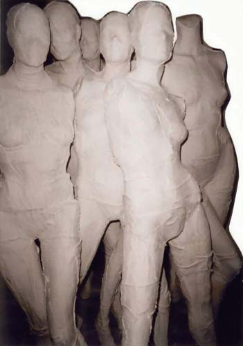 Liza Christofides exhibits plaster casts of her hands, in Handfulls, with an accompanying video, How Dry I Am, as well as paintings: When it is installed the space resembles a sea of hands. They cover the floor and wall space, leaving little room for the viewer to pass through the gallery...Each casting is the result of a particularly painful process. The idea of being subjected to pain was crucial to this work...My right hand is deliberately used in the moulding process, as it is the hand that I use for writing and creativity...The loss of this precious appendage reinforces the enactment of another's pain by bringing home the reality of the disabled or fragmented body... The formal element of whiteness is crucial to this exhibition as it alludes to a silent trauma.