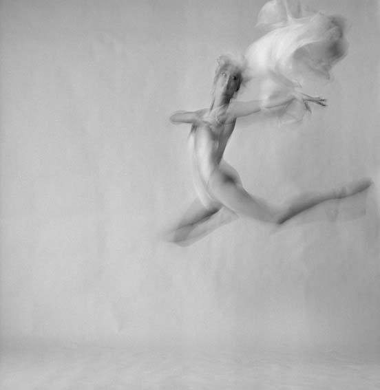 This exhibition is of 'vintage prints' - made between 1982 and 1986 - and has a different feel. Movement is a large element of this, drawing on De Mervelec's experience as a fashion and theatre photographer. Bodies caught in motion, swirled with veils, form part of the exhibition, as do landscapes, still, yet textured and full of energy.
