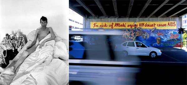 AIDS is also the subject of a tableau of small wooden figures by Johannes Mashego Segogela that shows a man dying at home in bed under the impassive gaze of his family, his priest and a television cameraman who records the details of a disease that is considered a mark of shame. A photographic diptych by Sue Williamson sets a portrait of an AIDS patient, wasted by illness, beside a shot of antigovernment graffiti splashed across the walls of a Cape Town underpass.