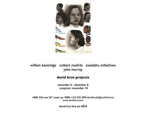 David Krut presents new and recent print works by Colbert Mashile, William Kentridge, Zwelethu Mthethwa and John Murray. All of the four these artists are eminently comfortable with the print medium.