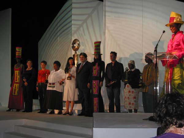 The symbol of the BKAA is a peacock feather, presumably considered suitable because peacocks wander round the lawns of Monterey, the Bishopscourt estate which is the headquarters of the organisation - and of course, peacocks have lots of lovely colours in their tail feathers. Projected graphics of swirling peacock feathers decorate the back of the hall, and appear again on an extremely kitschy powerpoint presentation about the enduring value of art, a presentation which I can see is causing suppressed mirth at a nearby table. Other entertainment includes Muse, the four woman string quartet, all dressed up by Hip Hop for the evening, followed by a ballroom dancing demonstration. The evening's emcee is TV personality Khanyi Dhlomo, also dressed bv Hip Hop. As with the Oscars, a glass table holds trophies of about Oscar height in what I would describe as a South African seventies design.