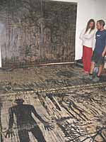 Greatmore Studios artist in residence Czechoslokian Jan Vicar, shortly to leave the country, is showing slides of his work tonight. His current work, wall sized woodcut images, printed in layers of colour, hang around the room. How on earth did he make such large scale works? Jan takes me into his studio. The man has treated the floor as a giant woodblock, cutting and incising his images into it, then inking up the floor, placing his paper facedown, and transferring the image by rubbing the back of the paper with a wooden spoon. The results are impressive.