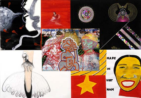 'Weather Report' is a series of collaborative works of art. In each artwork five artists from the 'four winds' are represented. During her journeys Enghardt cuts her travel-drawings into four pieces and divides those pieces among four artists. Using the piece as binding-factor, each artist works individually on the work of art, which arises when the four pieces are being put back together again. Rooted in a sense of limitation Enghardt invites artists she meets on her travels to create together a more complete image of reality. By rallying forces and connecting different points of view, 'Weather Report' increases the parameters of possible conversations across geographies.