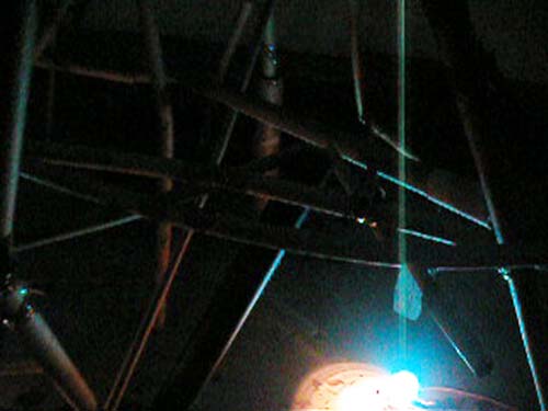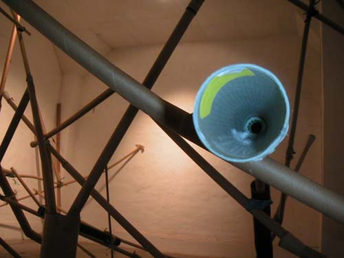 The installation in the main space consisted of cardboard tubes stuck together with packaging tape creating something akin to bamboo scaffolding which took shape across the floor and against the ceiling, dominating the space. Inside this skeletal 'deconstruction', speakers were placed with some ephemeral sounds emanating from them. Lit with blue light from underneath, the linear shadows on the ceiling drew attention to every exposed bit of electrical wiring and plumbing, painted pink by a participant to draw attention to unwanted structural components, usually hidden in gallery spaces.