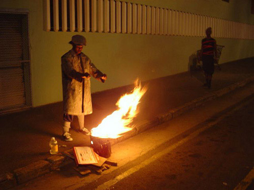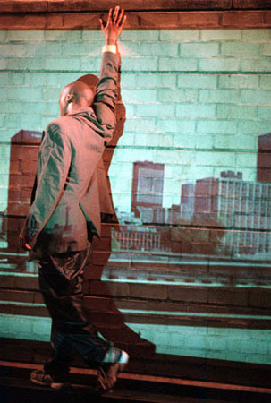 He places work in populated spaces, creating a synergy between its architectural form, the movement of pedestrians and the patterns and habits of its inhabitants. These contribute equally to the content and form of the work. The final product is shown in full-scale 'theatre' proportions, with stage sound, lighting and costume.