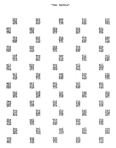 Boshoff, a pacifist, wrote his PRO PATRIA during a period of anxious military service. Five 'soldiers' are 'marching' across the page. Their trail of five rows of footprints repeat fragments of the words 'links - regs' (left - right). These broken syllables are interrupted by snippets of private thought that dwell on home, family and the easy life outside. The poem is to be recited by a platoon of five 'army' voices marching in tempo. The title Pro Patria is the order to march, and instead of yelling the self-assured "left, right, left, right ...," the troops bellow their time and intermixed thoughts simultaneously. The troop to the far left marches by the following abstruse three-letter cries: "bre, ekl, ink, sre, wer, kli, gsl, ink."