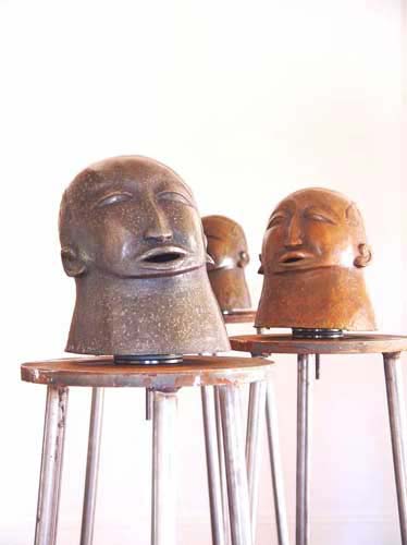 "Guy du Toit's sculpture, titled They all look the same to me, hey, and subtitled Four Brothers, is a work comprising four bronze heads on swivelled steel bases. These heads are made up of an amalgam of features grafted onto a Benin-style sculpture. They are almost cartoon-like. The features of each are similar although the bronze casting process and the intervention of the artist's hand has rendered each individual.