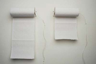 Other appliances reveal themselves more subtly as you enter the space. At eye level on the far wall, a kitchen towel dispenser moves in a measured rhythm of raveling and unraveling Carlton towels. Above the eye-line, a pulley system slowly moves a series of brightly coloured material pieces across the room, strung out like washing on a line.
