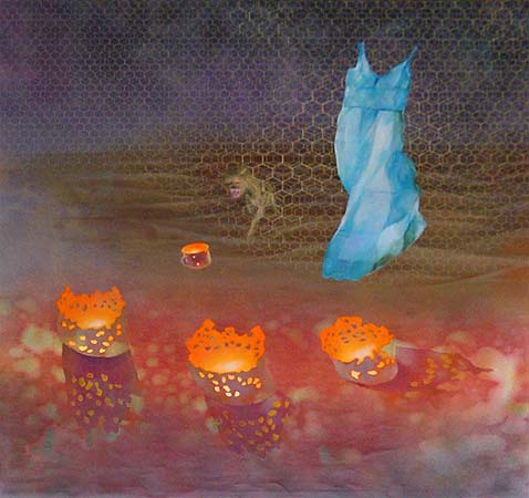 It was this detail that affected Judith so much, and motivated her to sew the dress out of plastic bags. She said 'It is not the armour of God, it's the protection I can give you'. She has written some beautiful words around the base of the dress. The idea of the dress soaring became one of the centrepieces of the paintings that she did, and its relationship with the predator, the rather strange fence, grid-like structure.