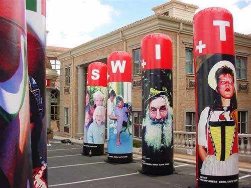 Artist Philipp Krebs recently displayed a new project at the opening of the Swiss Embassy in Pretoria. Taking his cue from the simple numerical fact that both the words Switzerland and South Africa are made up of eleven characters, he constructed 11 inflatable pillars for each of the two countries.