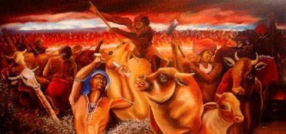 The large-scale paintings are placed in seven scenes that the viewer follows as one would read chapters in a book. Nhlangwini sets things apart and brings them together again as the old becomes new and visualised fantasy and known fact compete for survival in the arena as well as in one's head. His symbolism is strong and his colours are bold. The dominant reds and oranges refer to the part of Nongqawuse's prophecy claiming that on the appointed day "the sun will rise blood red with a terrible heat until it turned back at midday to set again". Although the reds dominate they are not over-used but rather they symbolise a deep ancestral connection, a nation in cleansing and a mystery long-standing.