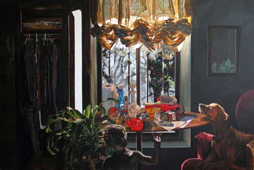 Safe House is another painting which is framed in a domestic interior, this time just the toddler and the dog are in the scene. The child's head seems uncomfortable on its body, twisted and unnatural. The room itself is crammed with objects: clothes, a plant, a laden table. A blinding light illuminates the background of this painting, highlighting the presence of an opulent curtain and the large plant in the foreground.