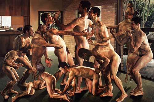 Light is another important aspect of Poynton's work � an element she plays with endlessly � alternately dazzling and disorientating us. With her masterful use of light, Poynton draws our attention to particular features, whether it is the distinct tone of a person's skin or the intricate folds in a rolled-up curtain. In Slapstick the figure of the moving man is accentuated by light, heightening his virility and presence, energising the surface of the painting.