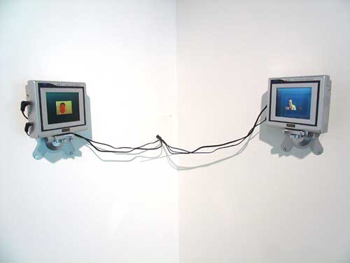 In more/cry (2002/3) the artist exposes himself further. This two-channel DVD installation is the only moving image in the space. Two tiny screens face-off in a corner of the space, allowing Fourie to dispassionately watch himself crying. The piece is based on Bas Jan Ader's black and white film, I'm Too Sad to Tell You (1971). Ader's tears are almost sinister in view of the remainder of his artistic career. Four years after completing this work the Dutch artist attempted to cross the Atlantic in a small sailing boat in a conceptual artwork entitled In Search of the Miraculous II and was never seen again. Six months later his vessel was found half submerged off the coast of Ireland.