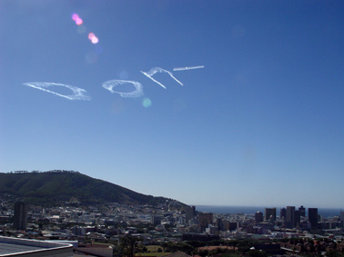 It may be a generalisation to say that most people don't look up. Certainly some don't. If you were in Cape Town at around 3.45 on March 21 you may have been prompted to look up however, because there in the bluest of skies were the words 'don't panic' written in smoke.