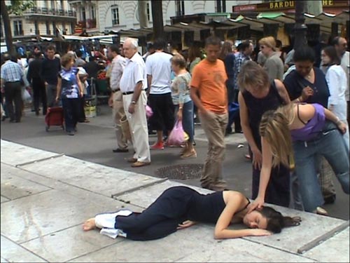 Thus we see Lovemore-Reed prostrate in various places - Muizenberg beach, a Khayelitsha market, a Cape Town taxi rank, Robben Island and Table Mountain as backdrop - relayed simultaneously on five monitors. On five screens directly opposite, we find her with the River Seine lapping at her clothes, at a Parisian market, on the Metro underground, alongside the Bastille, and near the Eiffel Tower. Each scenario is played out on a continuous 45-minute loop. Lovemore-Reed becomes the artwork along with the reactions of those around her. Our responses complete the meaning.