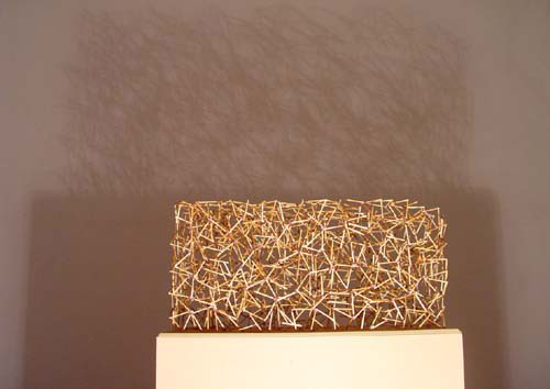 The pièce de resistance is a work entitled Altar. Situated in one of gallery rooms off the central space, it is a majestically quiet work, offset by a spotlight, which projects its shadow onto the wall. Altar comprises hundreds of matchsticks linked to one another like a DNA molecule. Each bears the name of an 'ism' written carefully on its four sides.