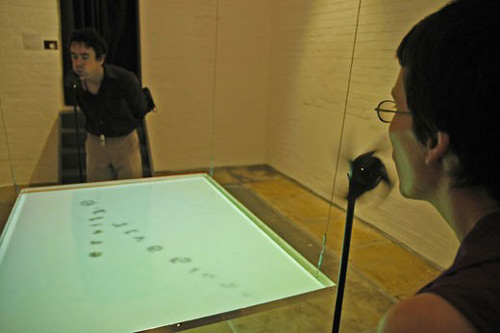This simple yet startling work uses soundwaves and amplitudes as triggers for the projection of flash video containing the snatches of text. The 'reduction' of poetic meaning to absolute instrumentality in the blowing of the windmills is a profound representational gesture, and of course viewers at the opening all failed to realise that the projection could be triggered by any sound into the contact microphones of the windmills; preferring to issue the breath of life and meaning.