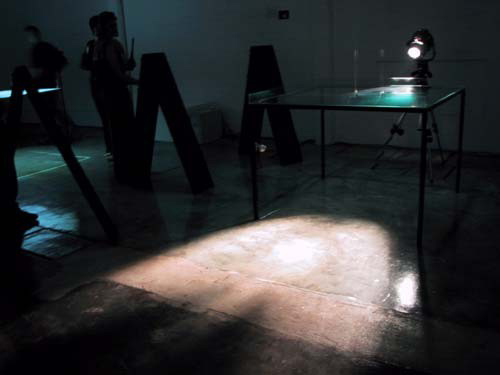 In a separate, elevated space at the rear of the exhibition venue was Kilpert's work in-camera. Setting up a web-cam through a pinhole in the side of the exhibition building, Kilpert built three layers of visual perception of the same image: the camera's projection, an inverted image, and a slide projection of a sequence of stills of the same imagestream.