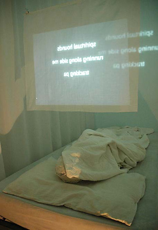 A cordoned-off area in the main exhibition space is accessed through filmy curtaining, through which a designated route leads the viewer to Alborough's installation, Night Journey. This work implicates the viewer in a technologically-mediated act of voyeurism in someone else's dreams. A digital camera captures the viewer's motion, triggering projections onto the dreamer's screen above a bed in which a figure lies swathed in blankets. The viewer becomes a ghost in a dream machine and the waking dreamer who revises the dream through the technology.