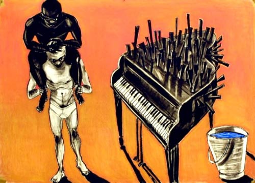 Vermeulen's 'Shadow Drawing' was motivated by a simple idea. He writes: 'One day I had the idea to draw a piano.I did that and saw that I needed a figure with it. An awkward space then made me put another figure on his shoulders and a technical problem caused this to be a black figure.Now the piano needed some foreign objects to penetrate it. A container with water and a warm background followed. The drawing started to dictate its own outcome, which then gave me ideas for a series of drawings. Only then did the drawings start to suggest possible readings or meanings.