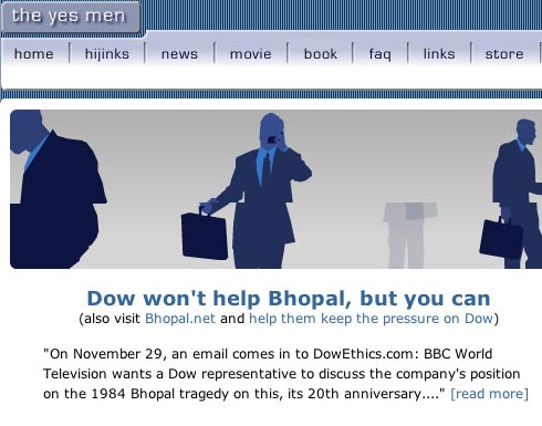 In 2004, a Yes man pretended that he was a spokesperson for Dow Chemicals in an interview with BBC. In the interview the Yes man stated that the company accepted responsibility for a leakage of lethal chemicals in Bhopal, India, which cost the lives of seven thousand people. In addition, he stated that a compensation fund has been set up for the victims. When Dow reacted (they had no choice), they not only had to tell everyone that the spokesperson was an impostor, but they were also forced to admit that they did not have a compensation fund, nor did they accept any responsibility for the disaster. Dow Chemicals lost two billion dollars in market value following the interview.