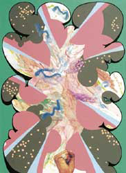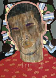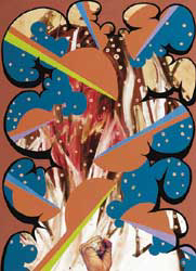 The paintings generally work well as a series. Maluka is a sophisticated painter who extends his play on visual codes within the canvases to a playful game between them. One overused stylistic device is the raised and clenched fist, which recurs as a collage element at the bottom of several canvases. This piston, shattering the visual plane, has a tendency to become repetitive rather than being a useful visual link � something already strongly provided in other ways.