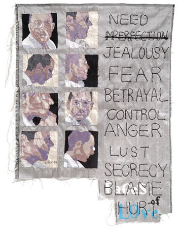 As with Faith, Love and Hope , she has worked on a raw silk 'canvas' forming images and words in silk collage, embroidery and beading to create these tapestries. The combined use of illustration and text communicates with the viewer on visual, conceptual and emotional levels, with things left unsaid to allow the viewer to participate in the story-telling.